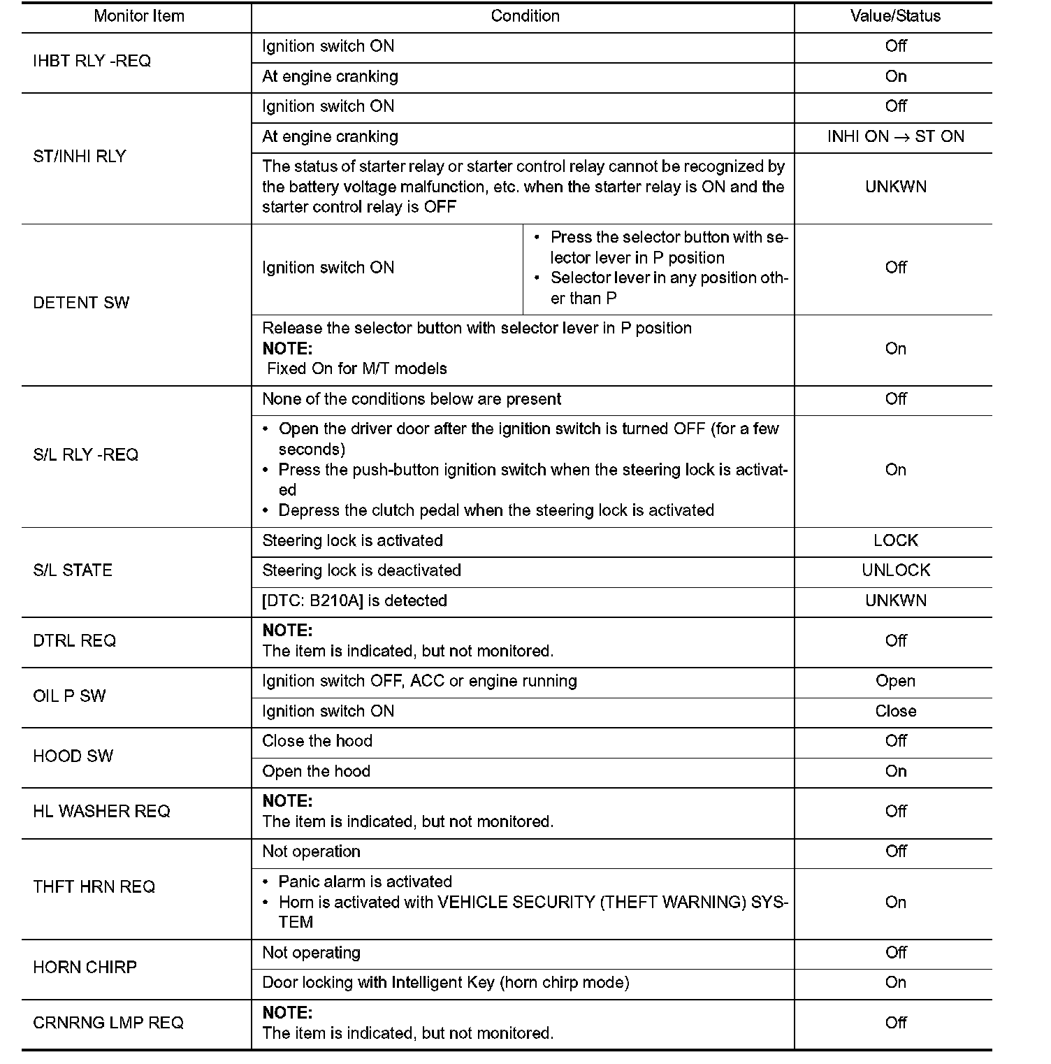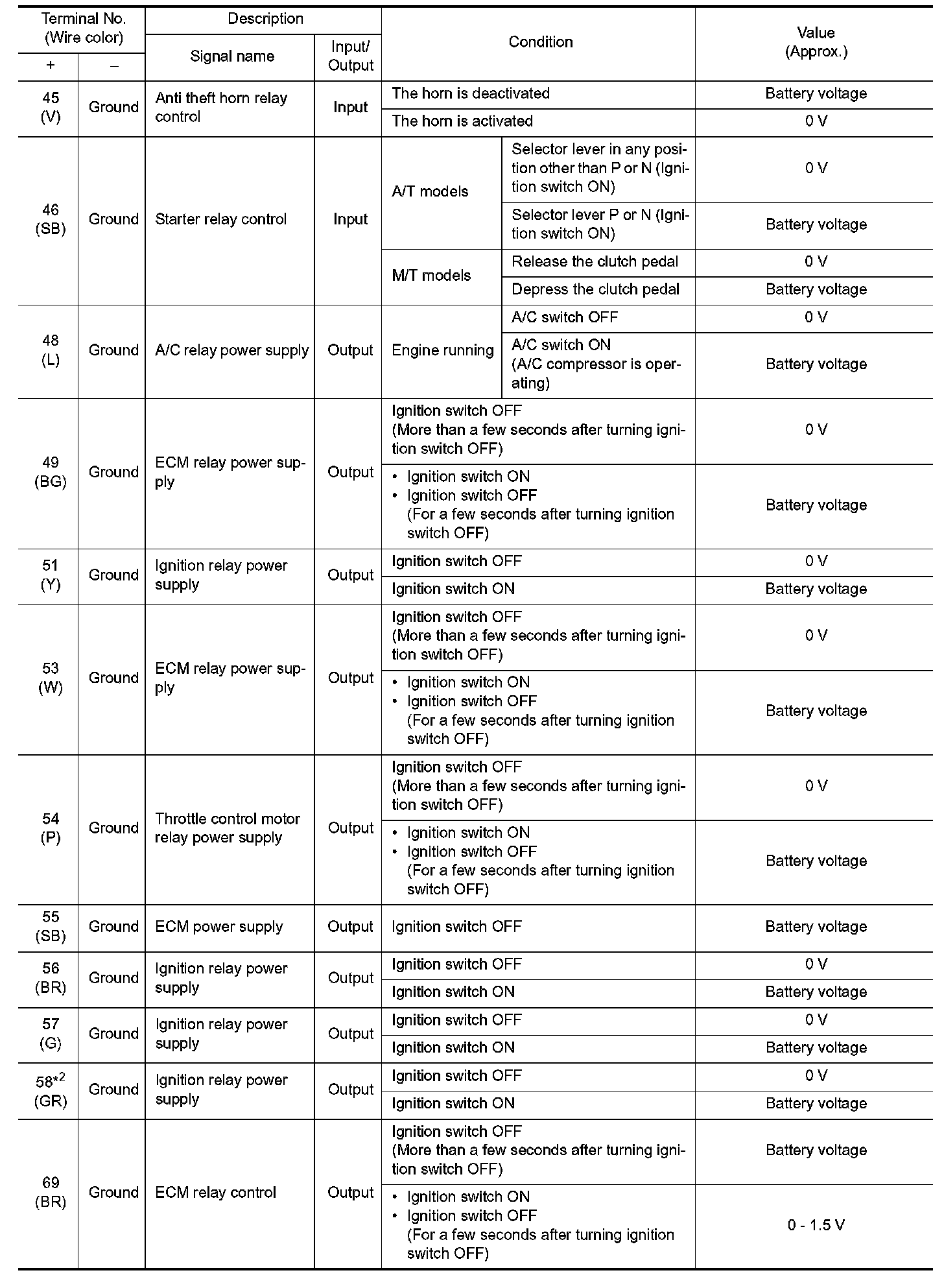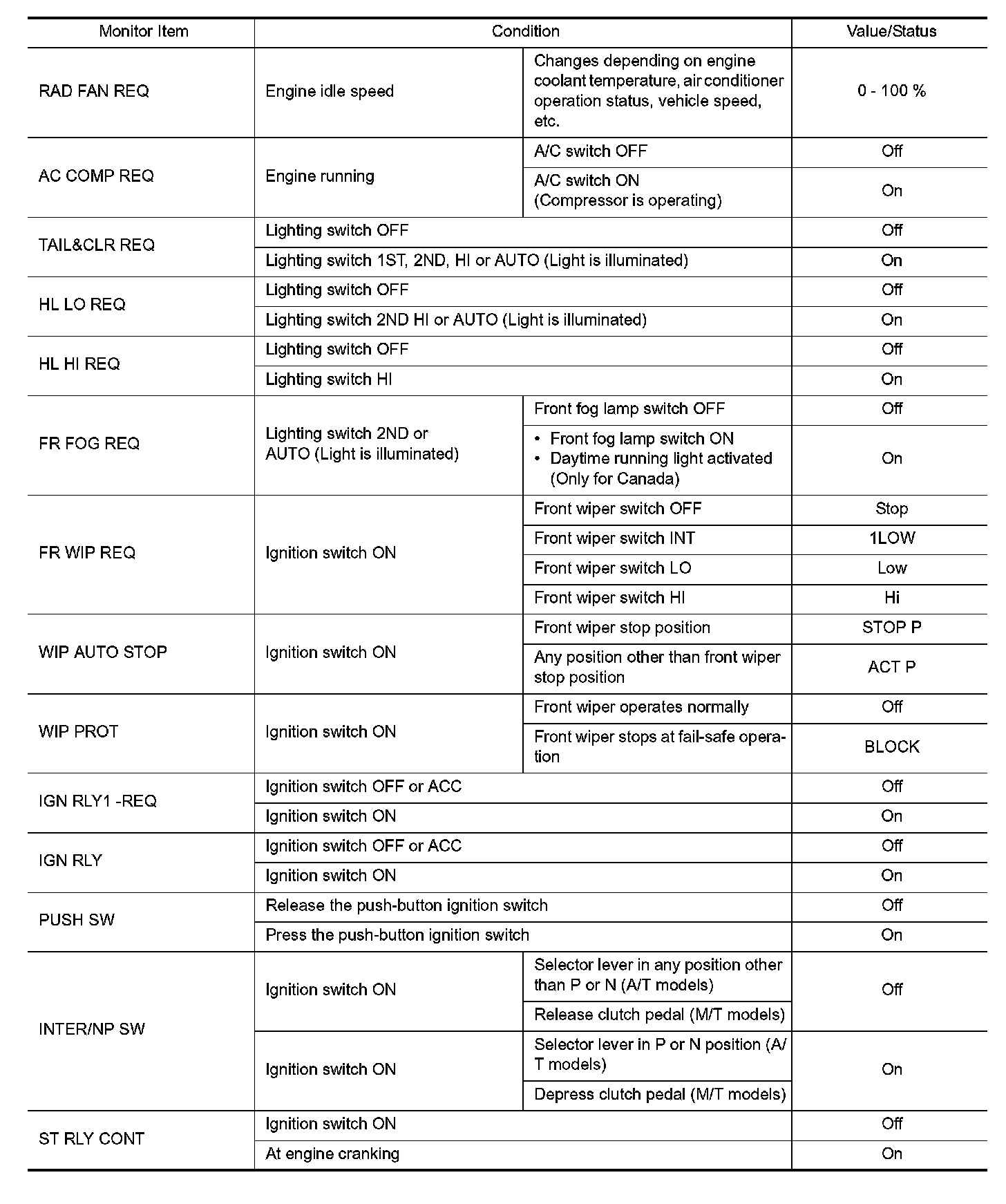 Pinout Values and Diagnostic Parameters