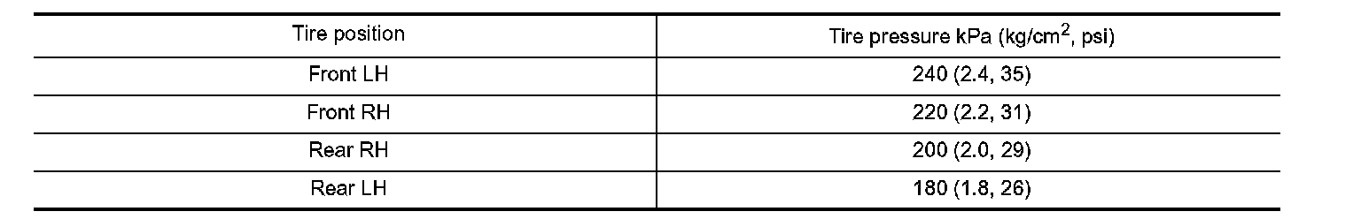 1. Adjust the tire pressure for all wheels to match the list below.