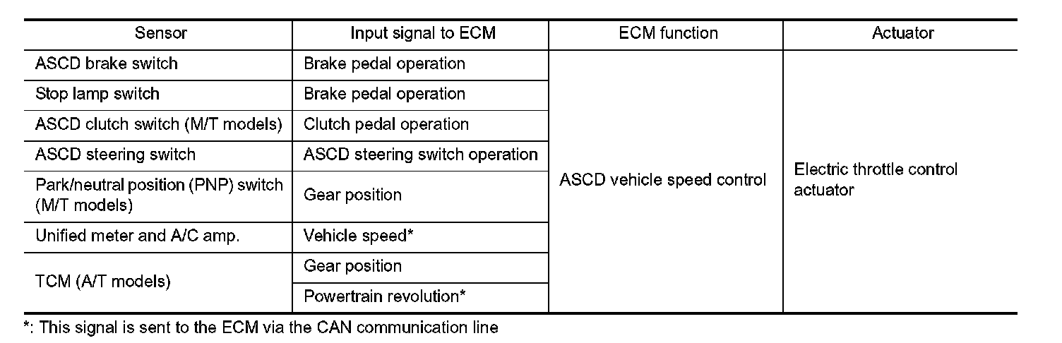 When the ECM detects any of the following conditions, the ECM will cancel the cruise operation and inform the driver by blinking indicator lamp.
