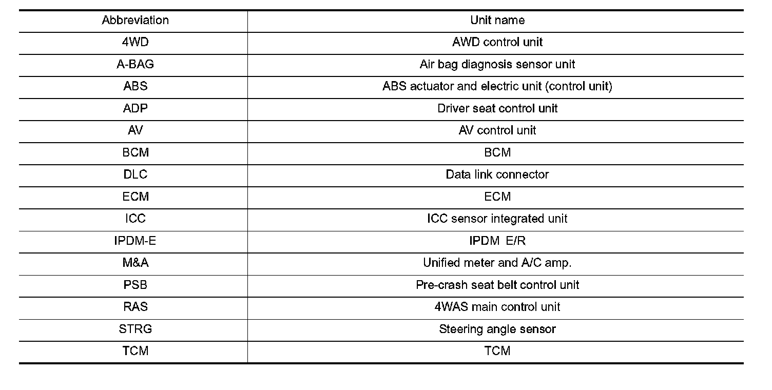 Unit name abbreviations in CONSULT-III CAN diagnosis and in this section are as per the following list.