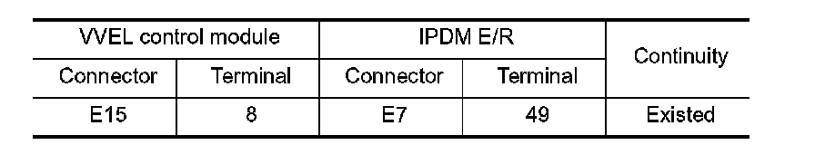 4. Check the continuity between VVEL control module harness connector and IPDM E/R harness connector.