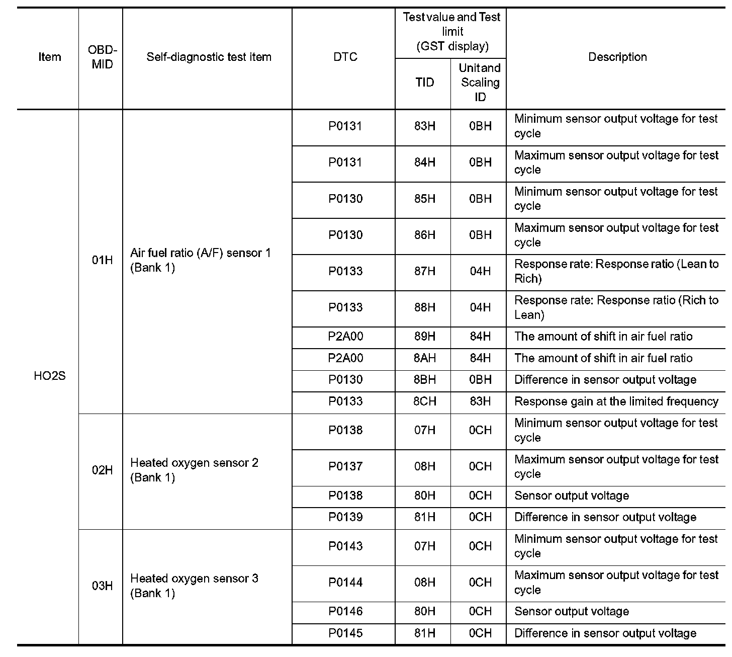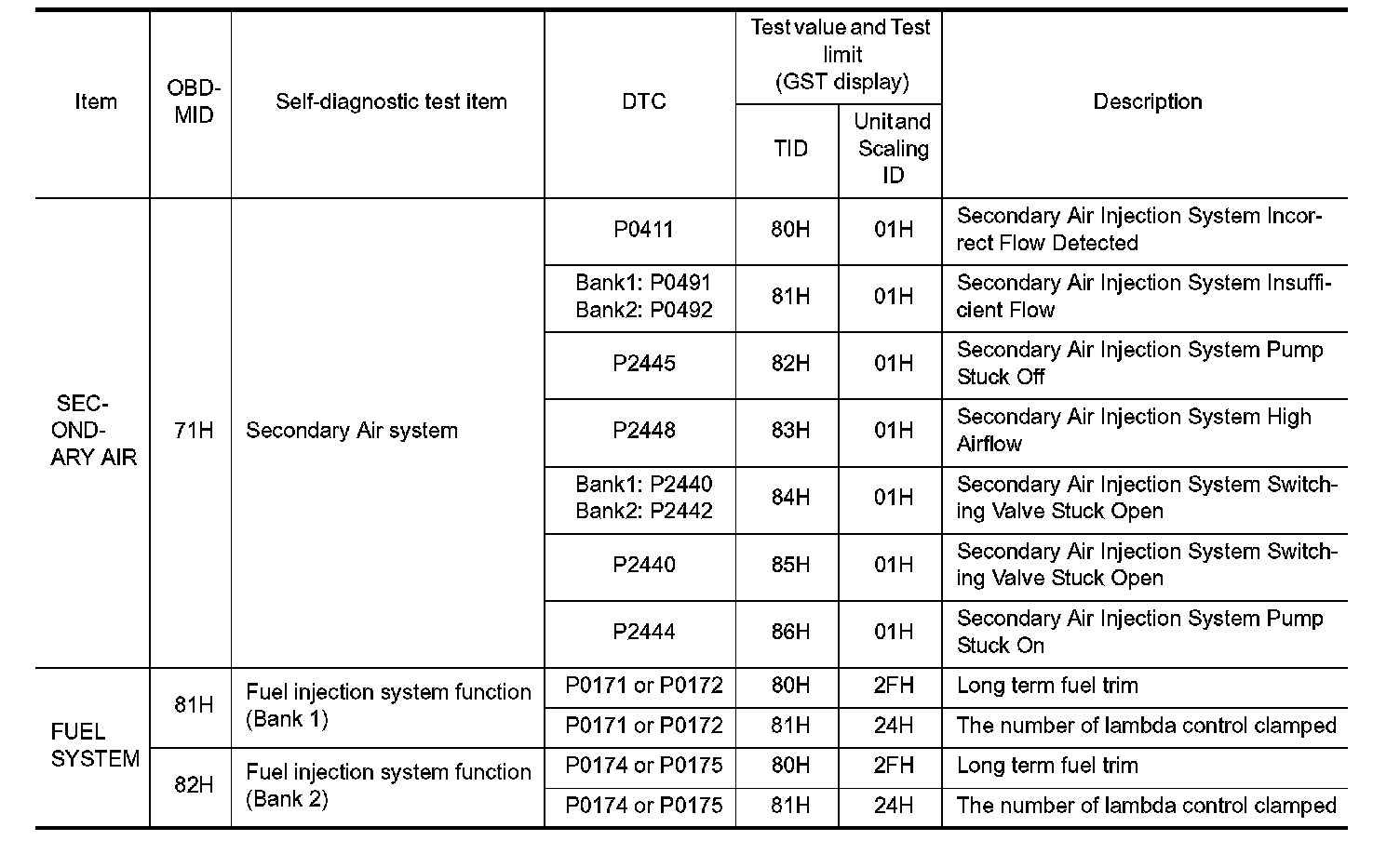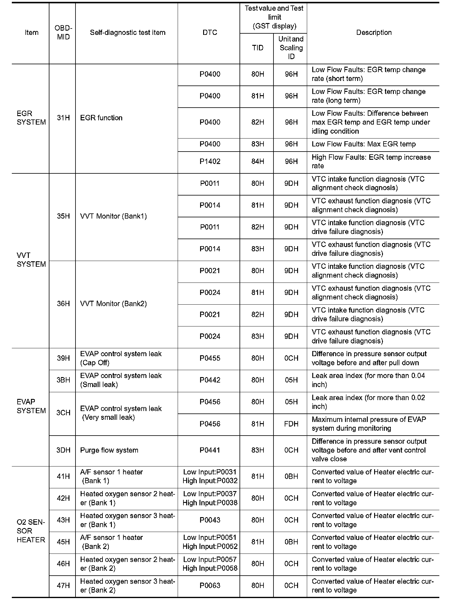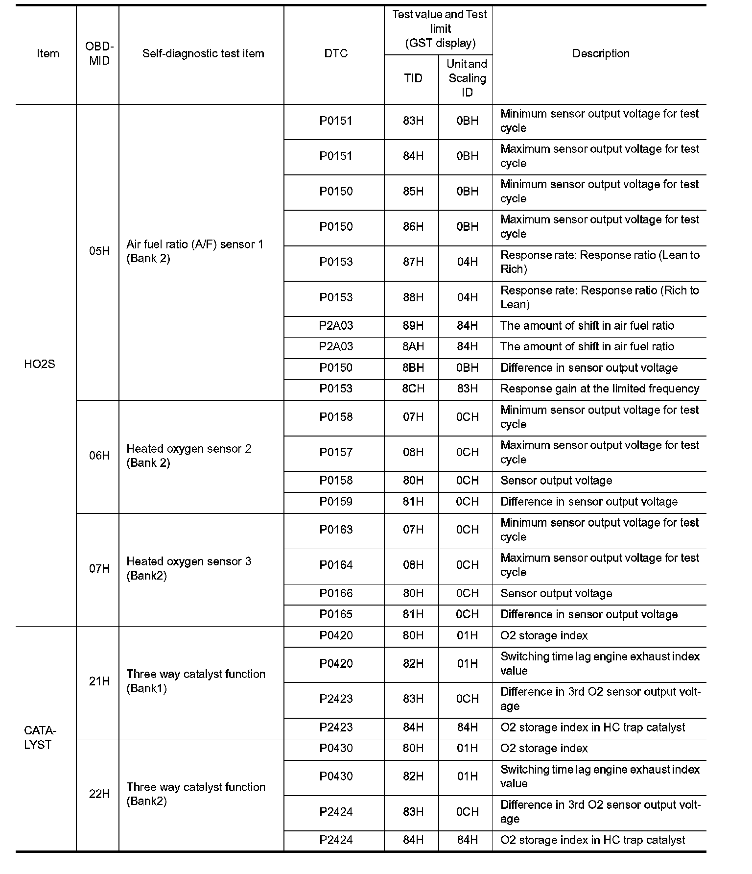 The items of the test value and test limit will be displayed with GST screen which items are provided by the ECM. (eg., if bank 2 is not applied on this vehicle, only the items of bank 1 are displayed)