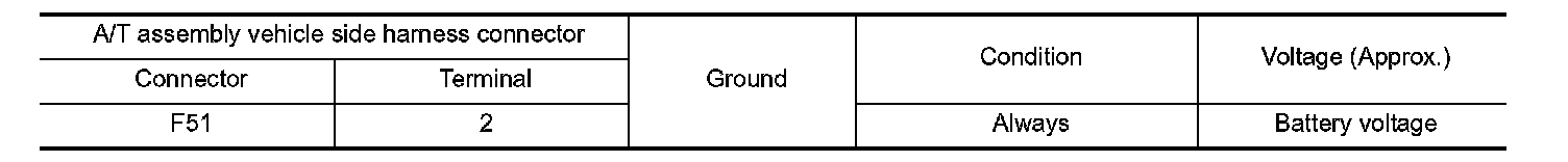 Check voltage between A/T assembly vehicle side harness connector terminals and ground.