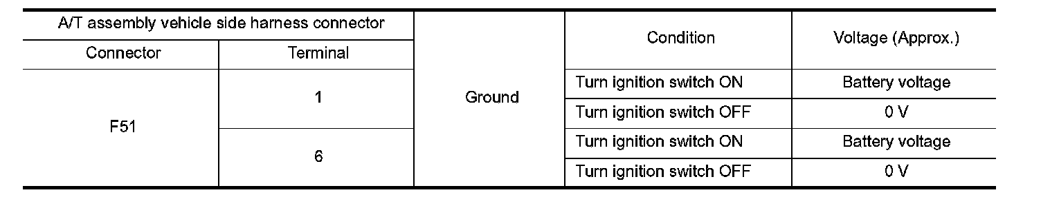3. Check voltage between A/T assembly vehicle side harness connector terminal and ground.