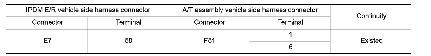 3. Check continuity between IPDM E/R vehicle side harness connector terminal and A/T assembly vehicle side harness connector terminals.