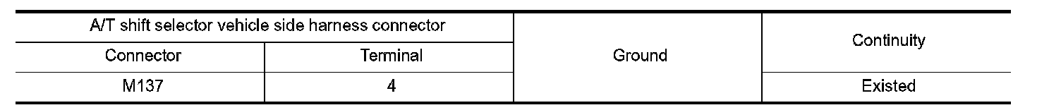 Check continuity between A/T shift selector vehicle side harness connector terminal and ground.