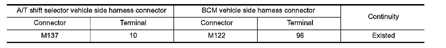 3. Check continuity between A/T shift selector vehicle side harness connector terminal and BCM vehicle side harness connector terminal.