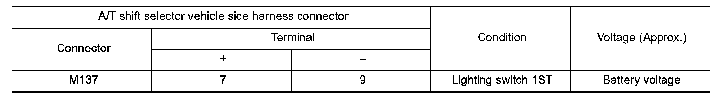 4. Check voltage between A/T shift selector vehicle side harness connector terminals.