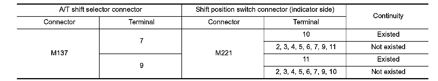 2. Check continuity between A/T shift selector connector terminals and shift position switch connector terminals (indicator side).