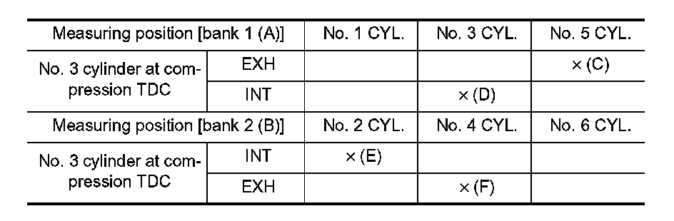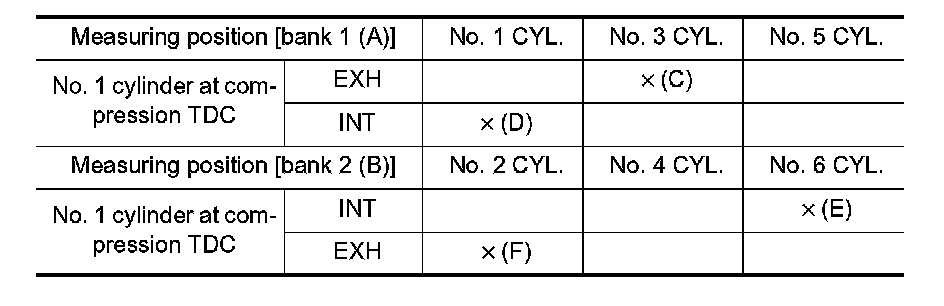 - By referring to the figure, measure the valve clearances at locations marked "�" as shown in the table below (locations indicated in the figure).