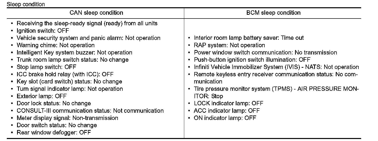 - BCM transmits the sleep wake up signal (sleep) to each unit when all of the CAN sleep conditions are fulfilled.