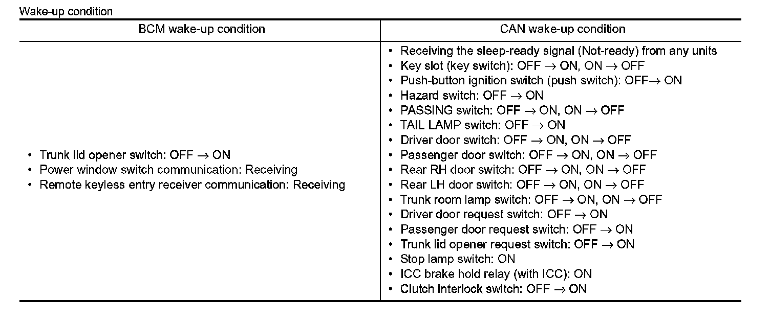- BCM transmits the sleep wake up signal (wake up) to each unit when any of the CAN wake-up conditions is fulfilled. It changes from the low power consumption mode or the CAN communication sleep mode to the normal mode.