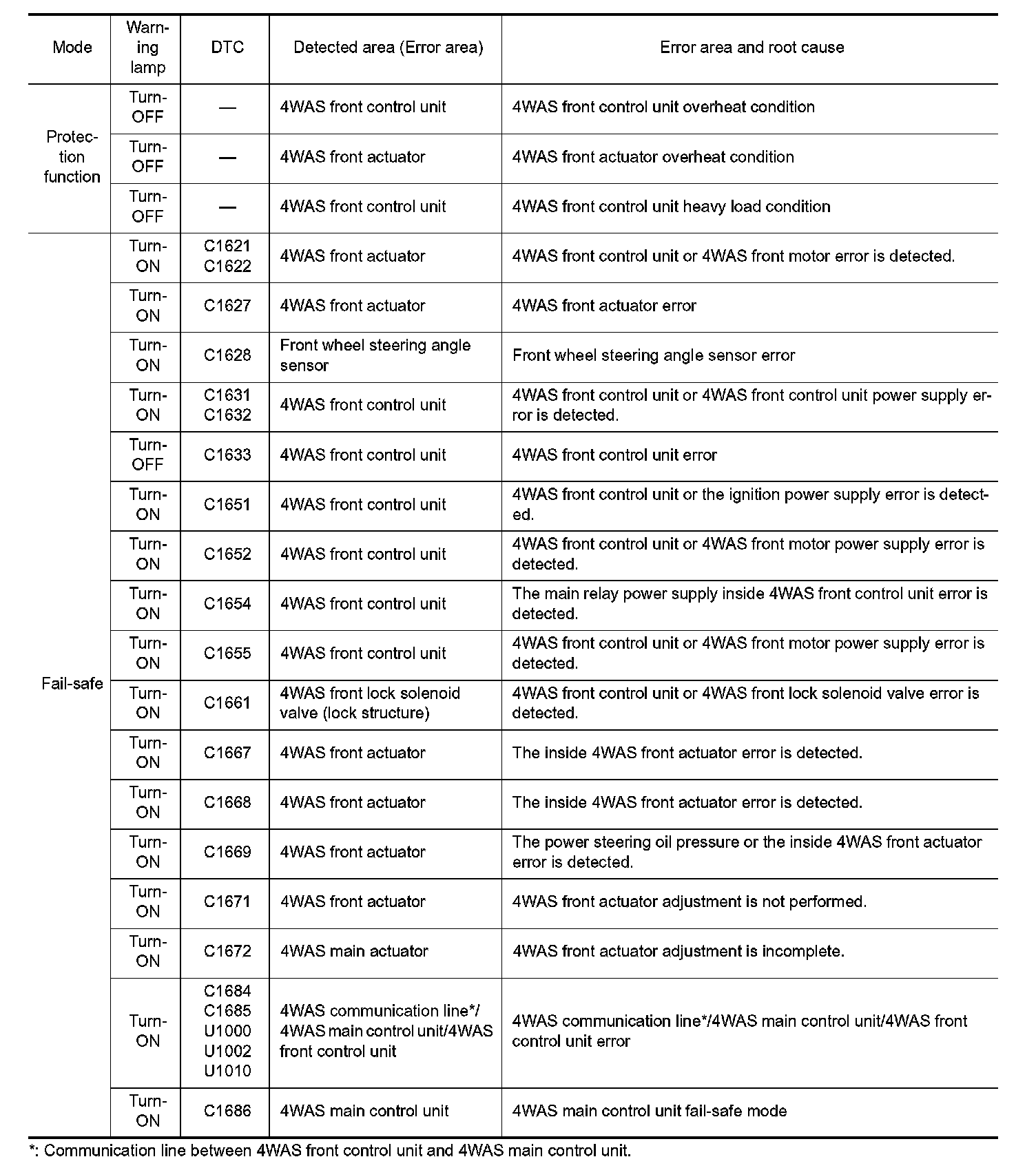 - 4WAS system enters in the fail-safe mode (4WAS system is stopped), and 4WAS warning lamp turns ON if an error is detected in 4WAS system (4WAS front control unit and 4WAS main control unit) component part.