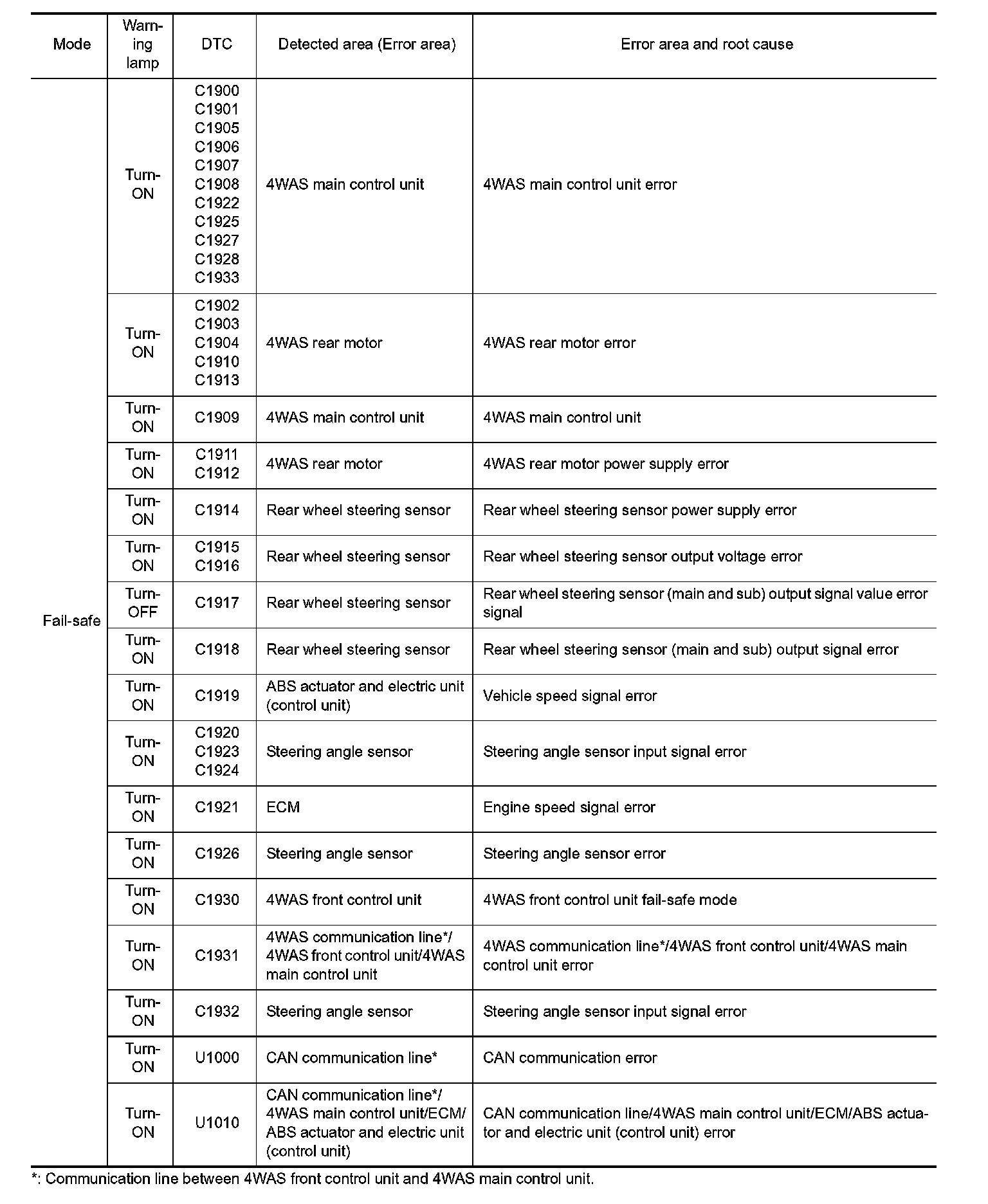 - 4WAS system enters in the fail-safe mode (4WAS system stopped) and 4WAS warning lamp turns ON if an error is detected in 4WAS system (4WAS main control unit) component part.