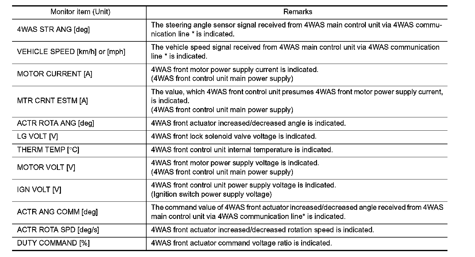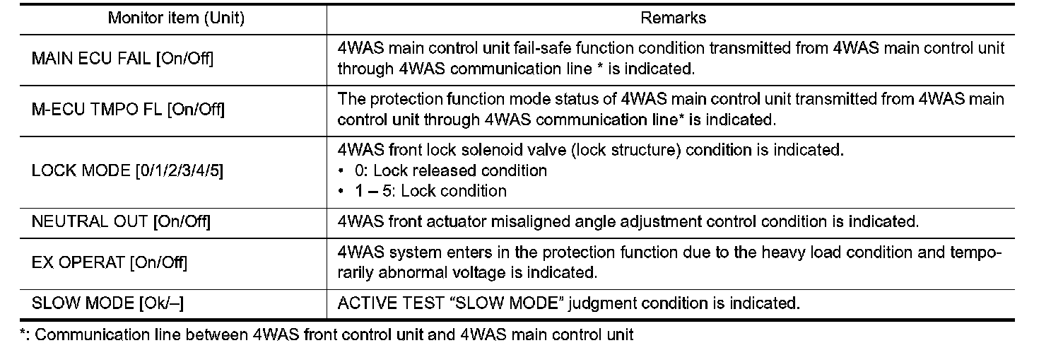 - The communication condition from 4WAS front control unit to 4WAS main control unit and malfunction counter are displayed.
