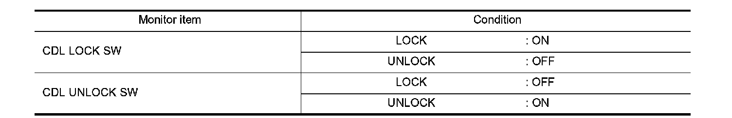 Check ("CDL LOCK SW ", "CDL UNLOCK SW") in "DATA MONITOR" mode for "POWER DOOR LOCK SYSTEM" with CONSULT-III. Refer to CONSULT-III Function (BCM - Door Lock).