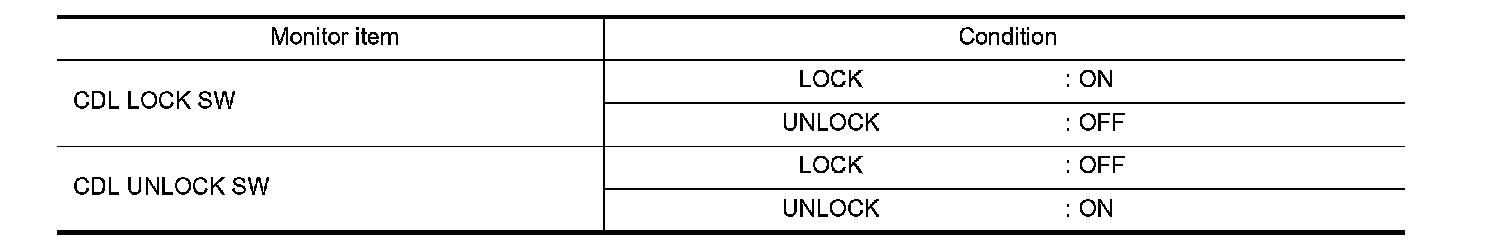 Check ("CDL LOCK SW ", "CDL UNLOCK SW") in "DATA MONITOR" mode for "POWER DOOR LOCK SYSTEM" with CONSULT-III. Refer to CONSULT-III Function (BCM - Door Lock).