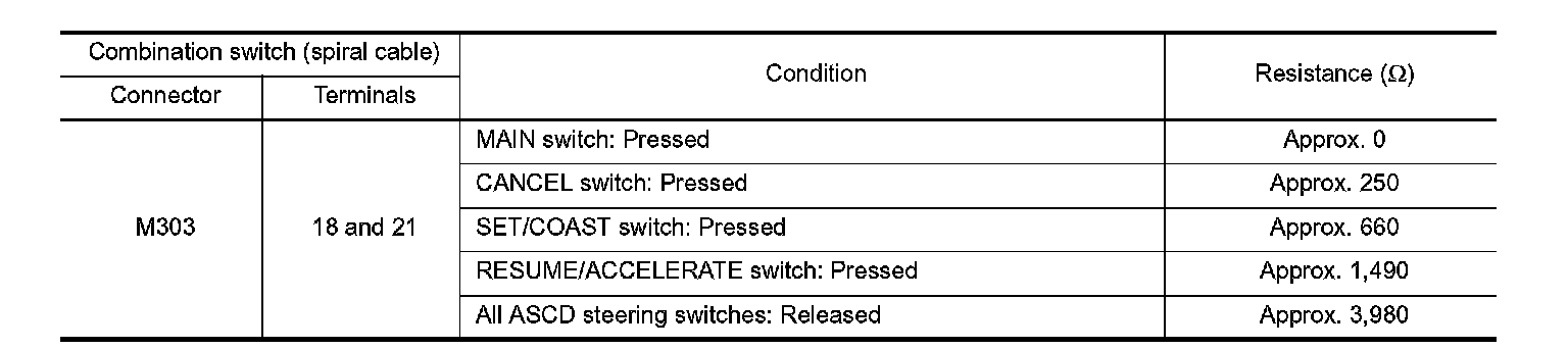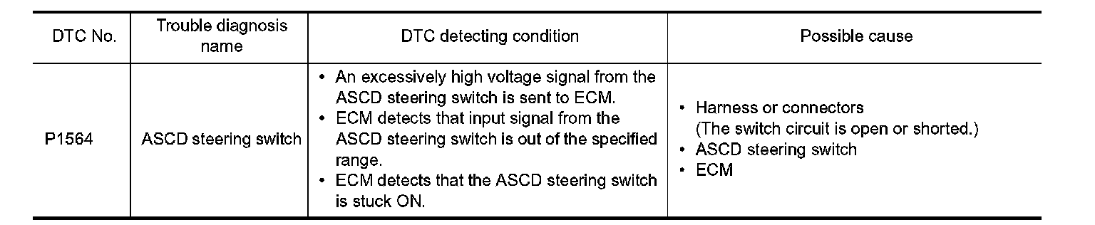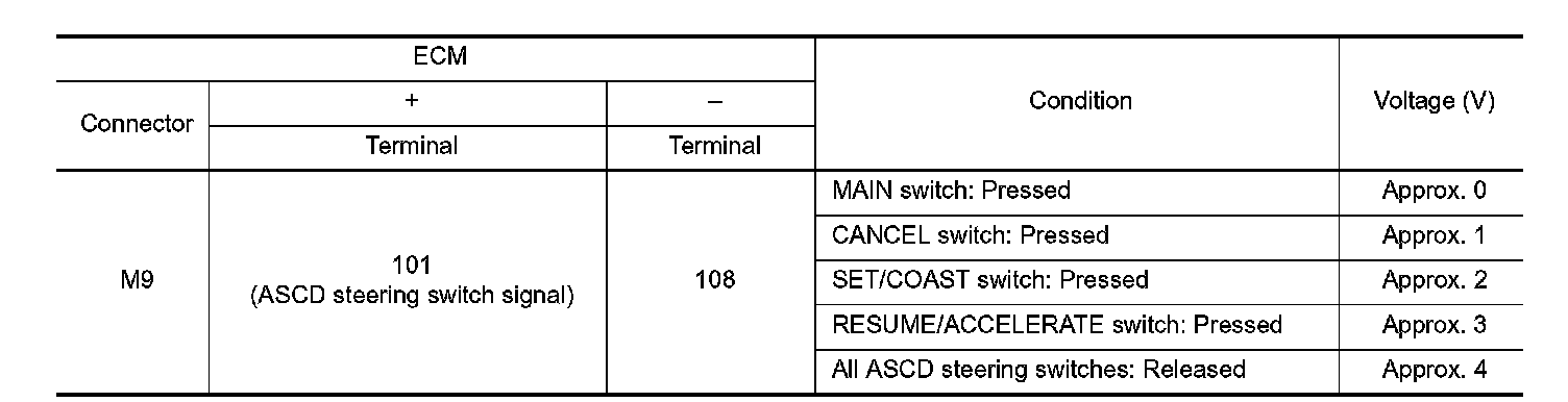 ASCD steering switch has variant values of electrical resistance for each button. ECM reads voltage variation of switch, and determines which button is operated. System Description for the ASCD function.