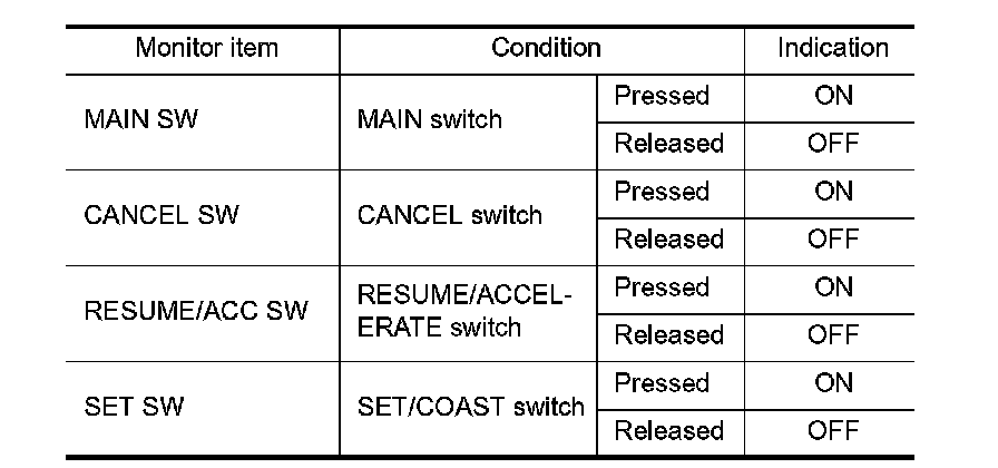 2. Select "MAIN SW", "CANCEL SW", "RESUME/ACC SW" and "SET SW" in "DATA MONITOR" mode with