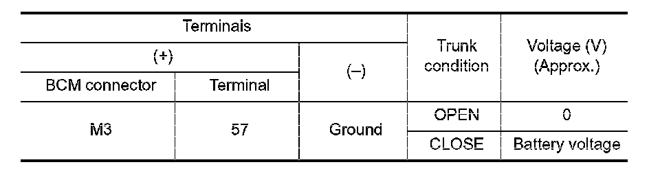 2. Check continuity between BCM connector and trunk lid lock assembly connector.