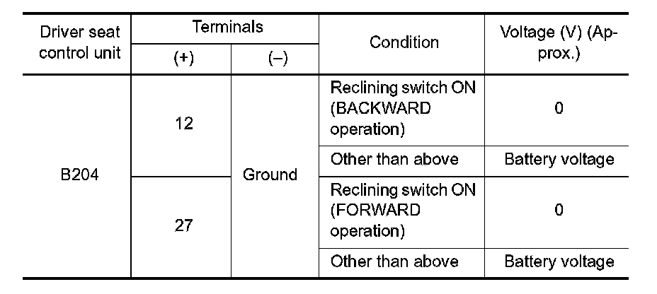 2. Check voltage between driver seat control unit connector and ground.
