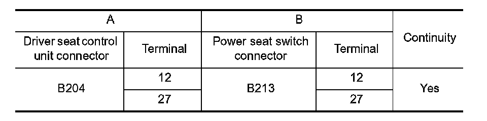 2. Check continuity between driver seat control unit connector and power seat switch connector.