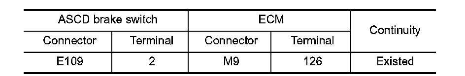 3. Check the continuity between ASCD brake switch harness connector and ECM harness connector.