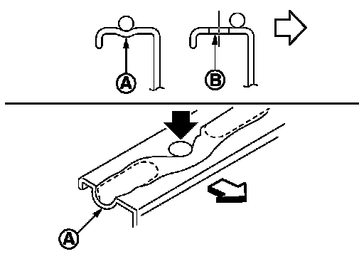 - Tap the seal cutter [SST: KV10111100 (J37228)] to insert it (B), and then slide (C) it by tapping on the side as shown in the figure.