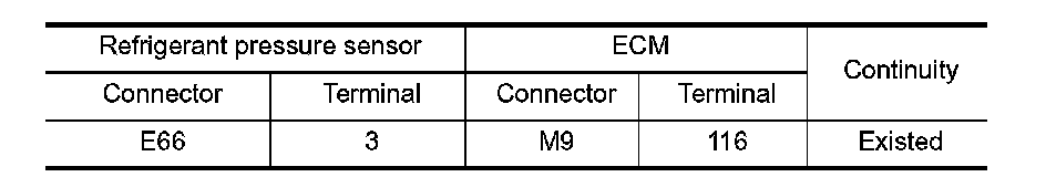 1. Check the continuity between refrigerant pressure sensor harness connector and ECM harness connector.