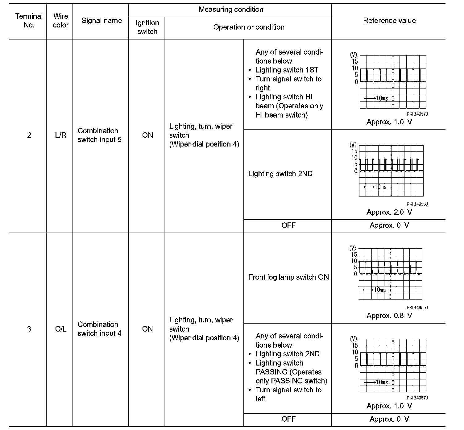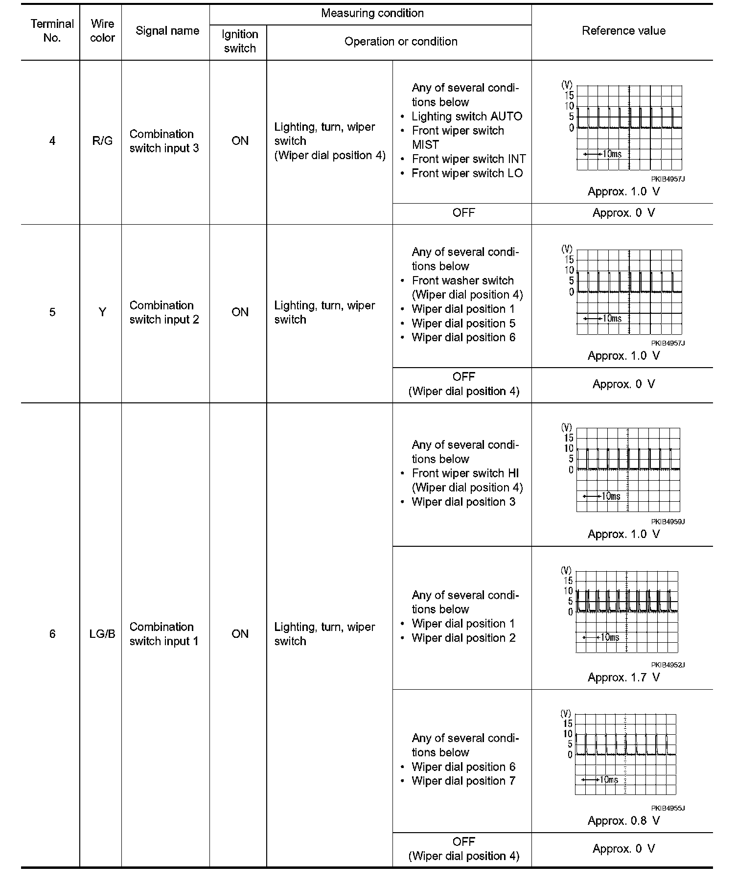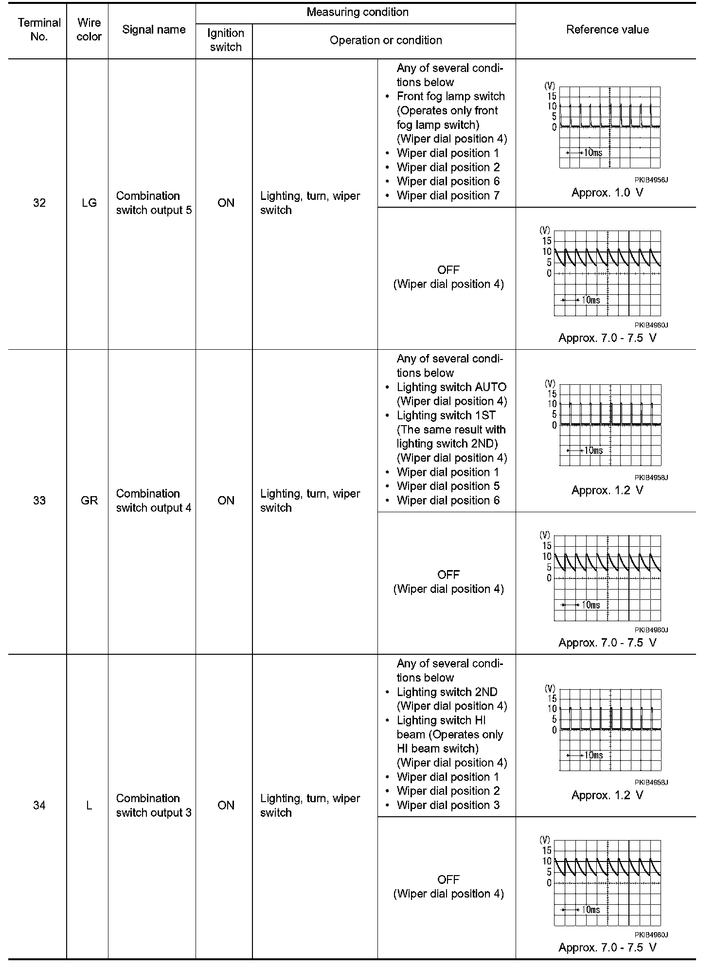 - Check combination switch system terminal waveform under the loaded condition with lighting switch, turn signal switch and wiper switch OFF not to be fluctuated by overloaded.