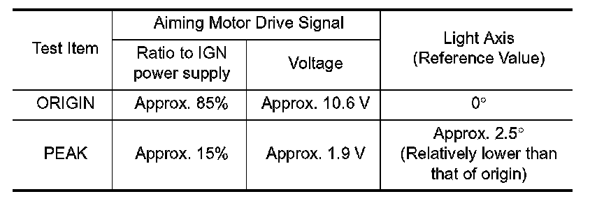 Aiming motor drive signal can be changed to approx. 85% (ratio to IGN power supply) by touching "ORIGIN", and to approx. 15% by "PEAK". That angles headlamp LO up and down.