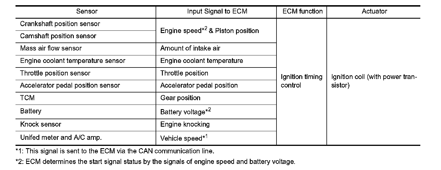 The ECM receives information such as the injection pulse width and camshaft position sensor signal. Computing this information, ignition signals are transmitted to the power transistor.