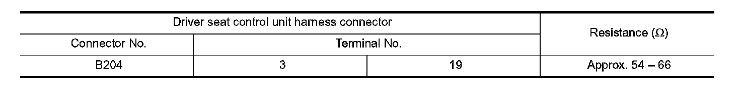 2. Check the resistance between the driver seat control unit harness connector terminals.