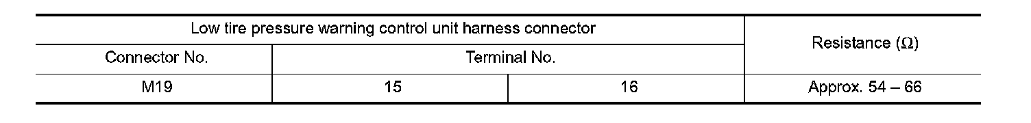 2. Check the resistance between the low tire pressure warning control unit harness connector terminals.