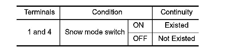 3. Check the continuity between snow mode switch terminals under the following conditions.