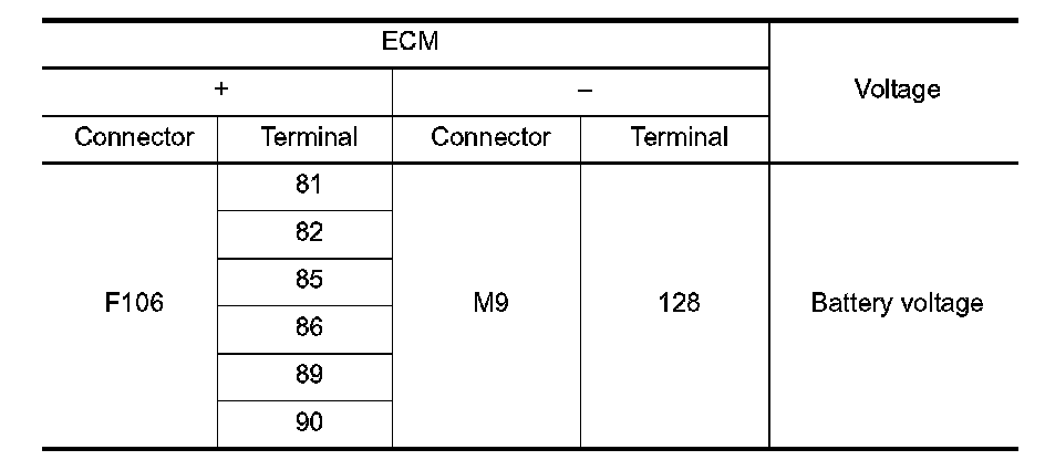 2. Check the voltage between ECM harness connector terminals as per the following.