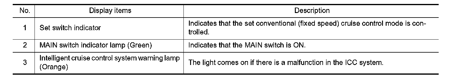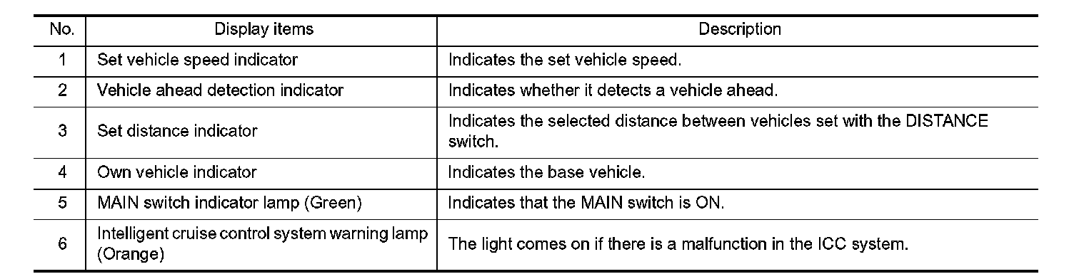 The status of ICC system is displayed by dot matrix LCD, MAIN switch indicator lamp and ICC system warning lamp on the combination meter.
