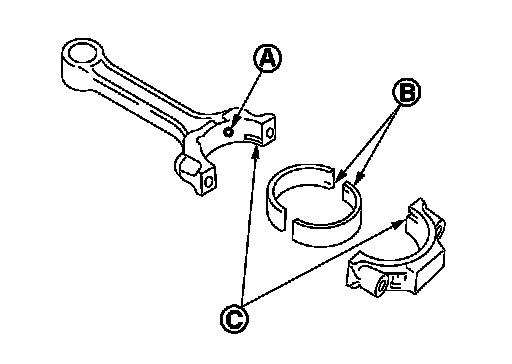 - When installing, align connecting rod bearing stopper protrusion (B) with cutout (C) of connecting rods and connecting rod bearing caps to install.