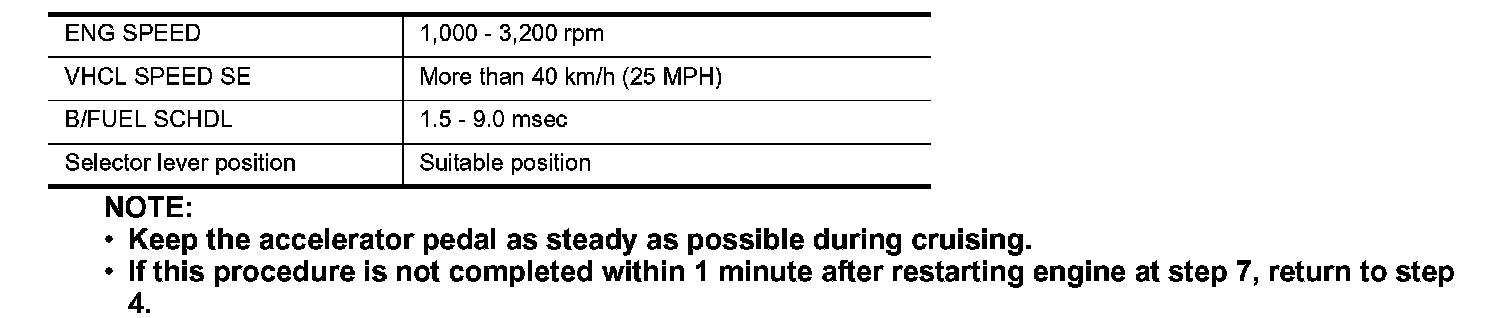 8. Drive and accelerate vehicle to more than 40 km/h (25 MPH) within 20 seconds after restarting engine.