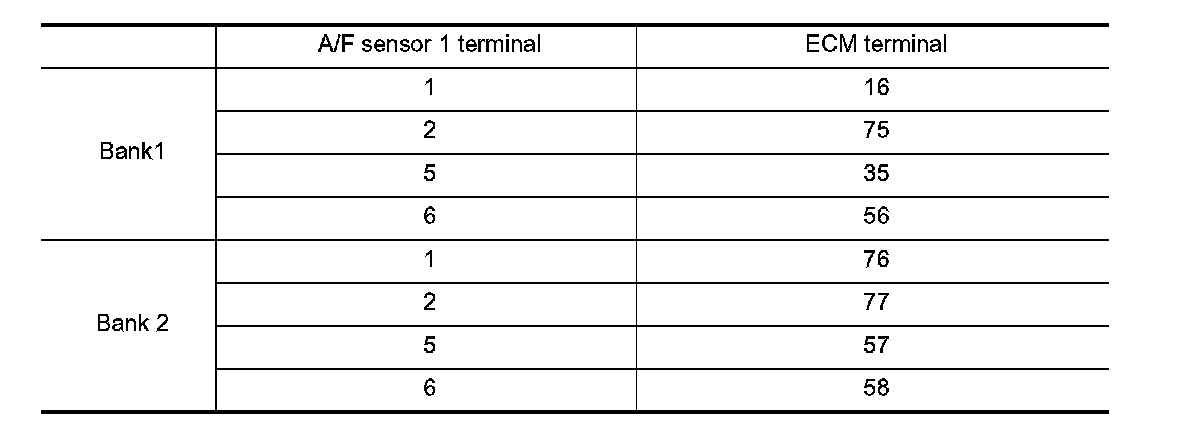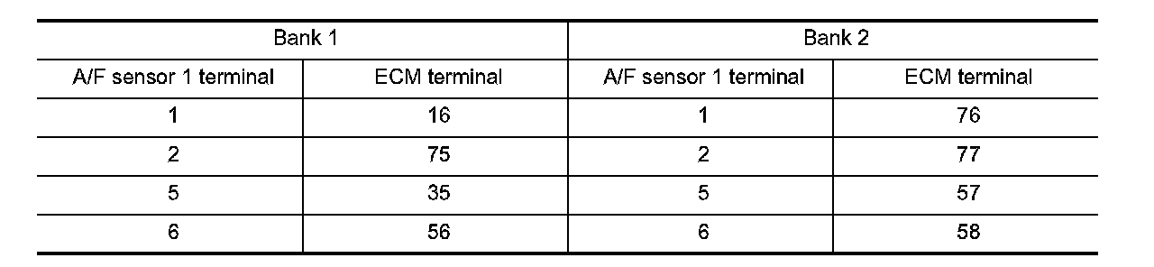 3. Check harness continuity between A/F sensor 1 terminal and ECM terminal as per the following. Refer to Wiring Diagram.