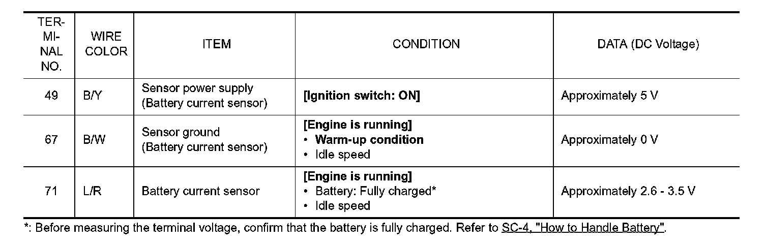 The power generation voltage variable control enables fuel consumption to be decreased by reducing the engine load which is caused by the power generation of the generator. The battery current sensor (1) is installed to the battery cable at the negative terminal. The sensor measures the charging/discharging current of the battery. Based on the sensor signal, ECM judges whether or not the power generation voltage variable control is performed. When performing the power generation voltage variable control, ECM calculates the target power generation voltage based on the sensor signal. And ECM sends the calculated value as the power generation command value to IPDM E/R. For the details of the power generation voltage variable control, refer to SC section.