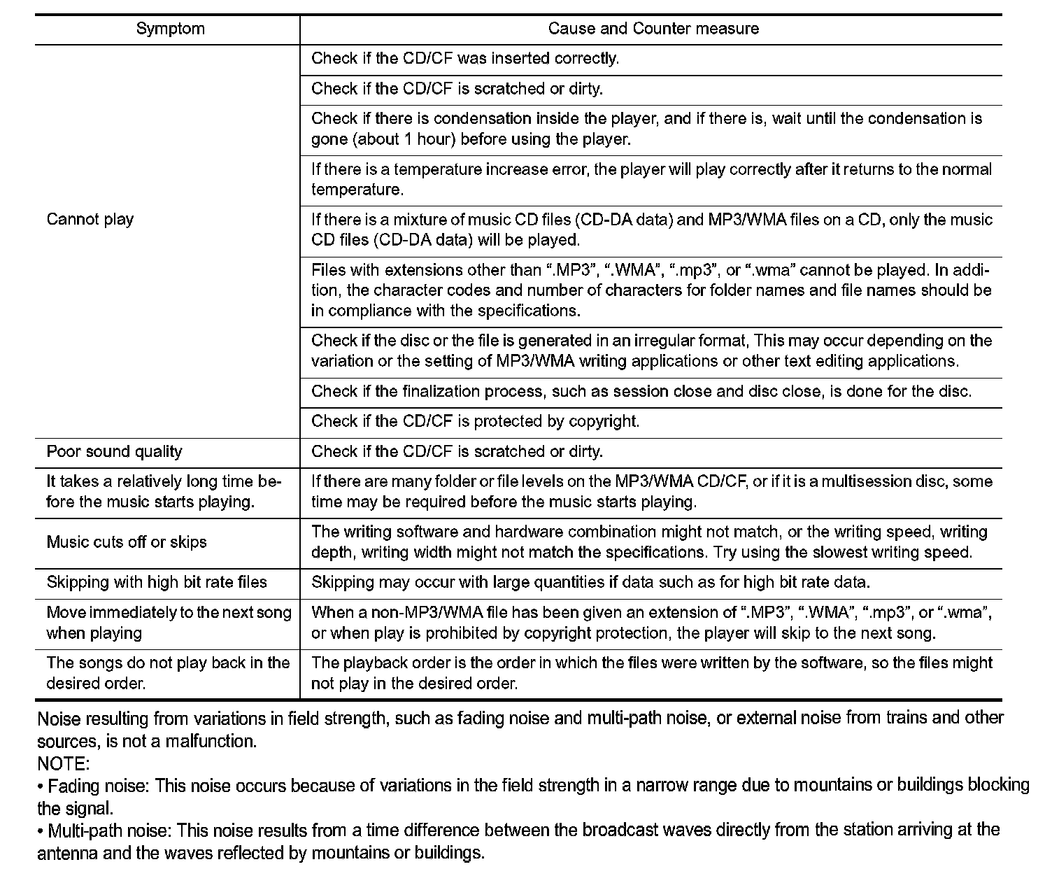 - The majority of the audio malfunctions are the result of outside causes (bad CD/cassette, electromagnetic interference, etc.). Check the symptoms below to diagnose the malfunction.