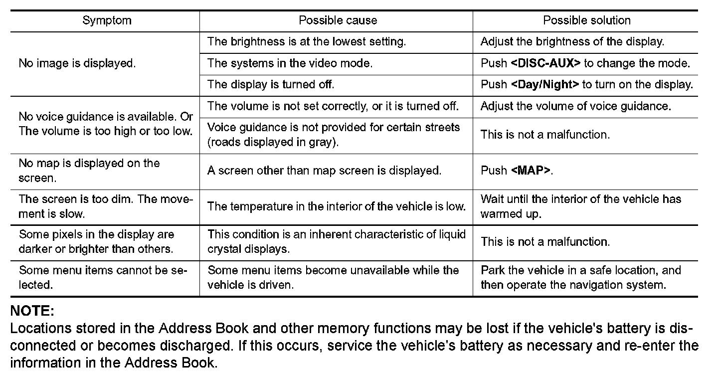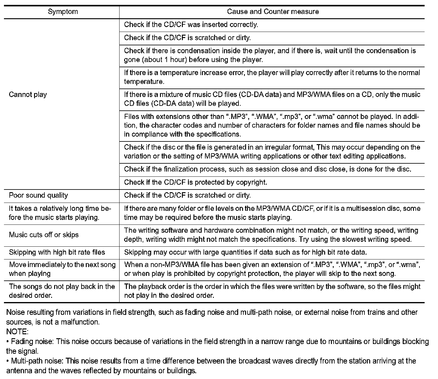 - The majority of the audio malfunctions are the result of outside causes (bad CD/cassette, electromagnetic interference, etc.). Check the symptoms below to diagnose the malfunction.