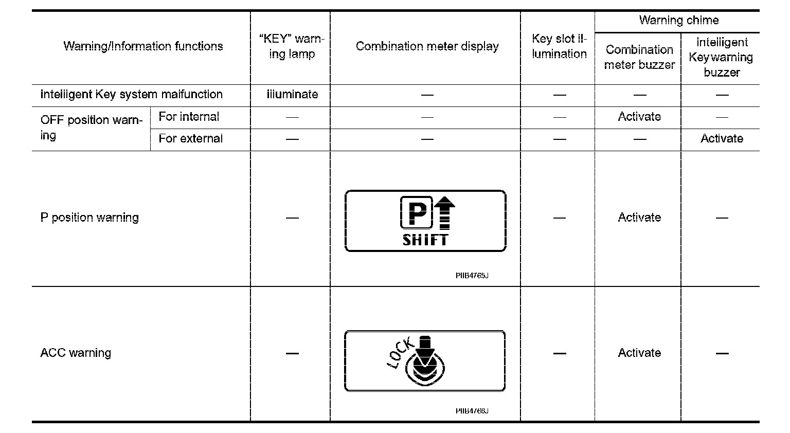 The warning function are as follows and are given to the user as warning information and warnings using combinations of Intelligent Key warning buzzer, KEY warning lamp, key slot illumination and combination meter display in combination meter.