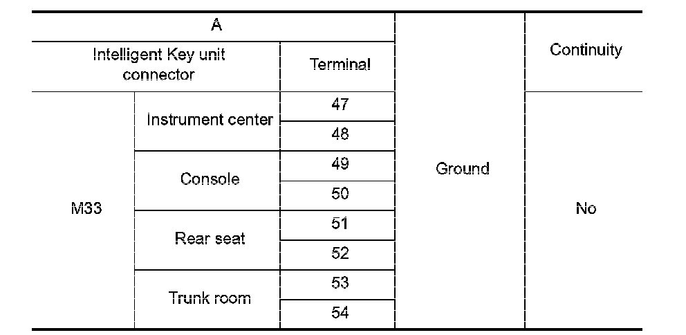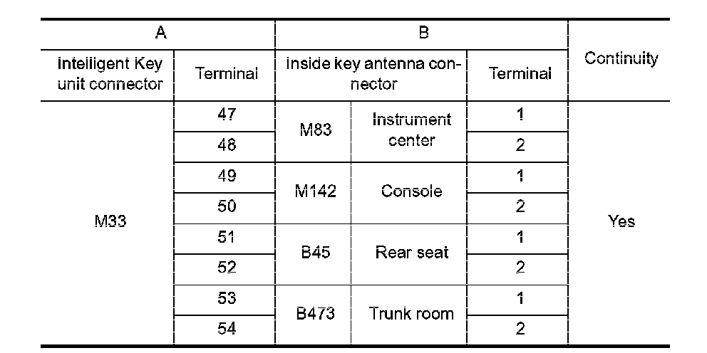 2. Check continuity between Intelligent Key unit connector and inside key antenna connector.
