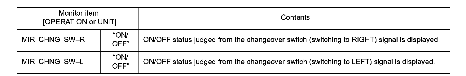 Check the operation on (MIR CHNG SW-R" or "MIR CHNG SW-L) in the DATA MONITOR.