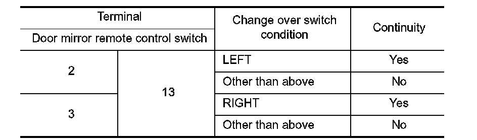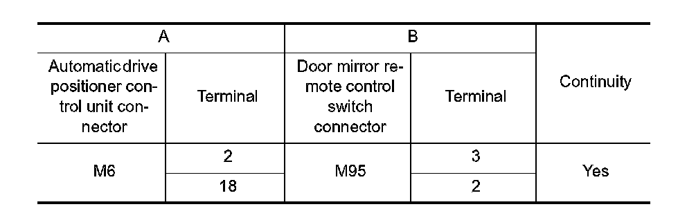 3. Check continuity between automatic drive positioner control unit connector and door mirror remote control switch connector.