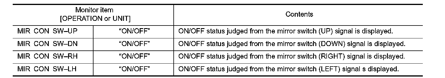 Check the operation on "(MIR CON SW�UP/DN) and (MIR CON SW�RH/LH) in the DATA MONITOR.