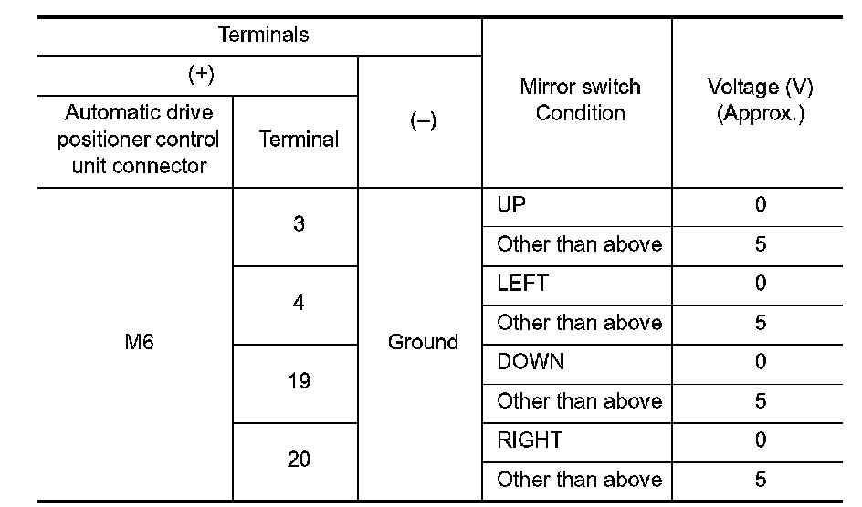 2. Check voltage between automatic drive positioner control unit connector and ground.