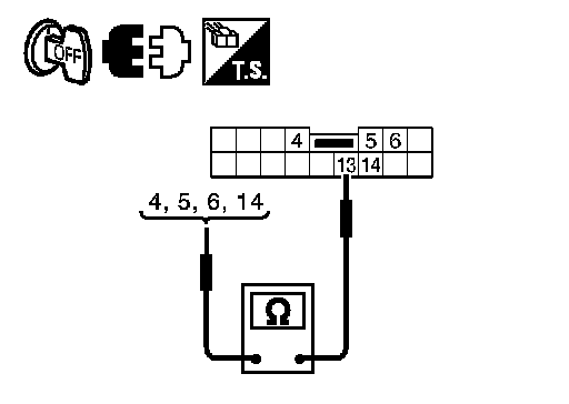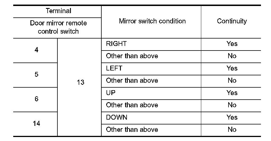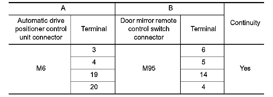 3. Check continuity between automatic drive positioner control unit connector and door mirror remote control switch connector.
